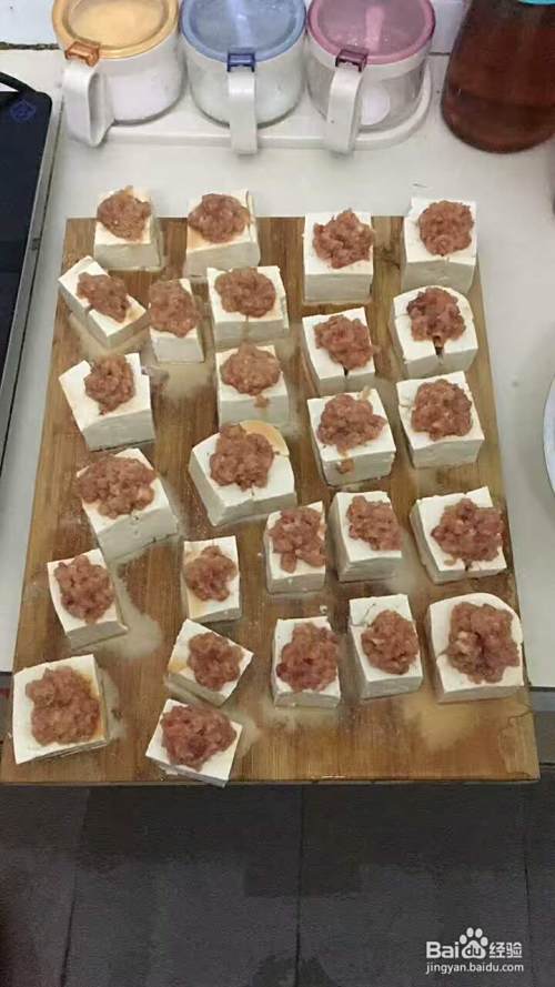 腌好肉后,豆腐先切小方块,然后在小方块上面再挖一个小方块的坑。