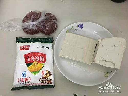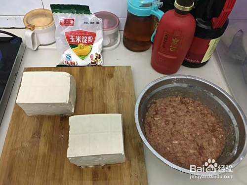 先把豆腐用水泡会,把肉(这次买到纯瘦肉,要五花肉才好吃)剁成肉末,用淀粉,生抽,油、盐,蒜头,料酒腌制10分钟。