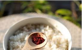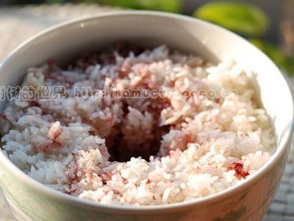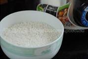 6糯米饭打松,中间挖一洞,红曲粉与酒曲用冷开水拌匀撒入摊凉的糯米饭中,同时倒入一小杯纯糯米酒