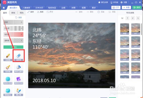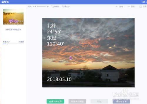 如图,图片左边中间的地方有个消除笔,点击消除笔,然后美图秀秀就会弹出消除界面,这时用鼠标涂抹需要消除的区域(以修改日期为例)。把日期消除完后点击应用当前效果。
