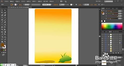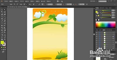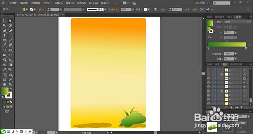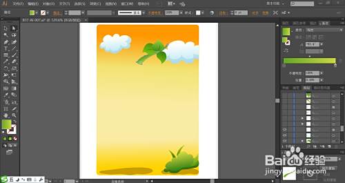 接着,我们用绿色的渐变填充一下草地上面的植物的路径,再用半透明的暗绿色与黄绿色分别填充植物的暗光与高光路径。