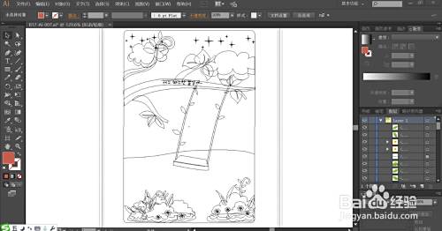 先用钢笔画出天空与草地的基本轮廓,再画出天空中的云朵的细节,继续画出树枝与秋千的细节,最后,我们画出草地上面的植物与花朵的路径。