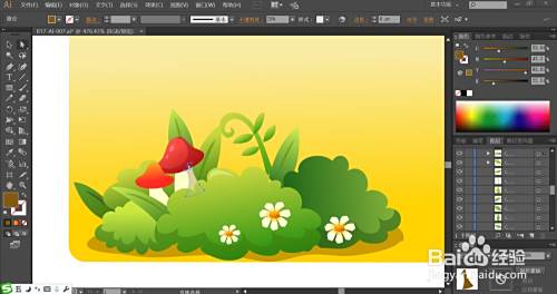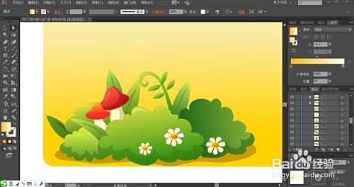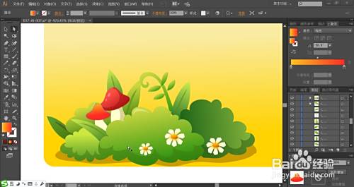 这一步,我们用红色的渐变与灰白色的渐变填充草丛里的蘑菇,再用灰白色的渐变与橙黄色的渐变填充花朵的结构件。