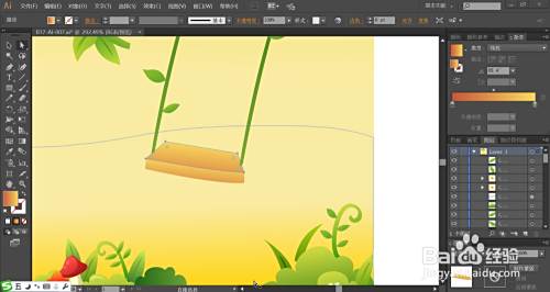 最后,我们用绿色的渐变填充秋千的绳索,再用黄棕色的渐变填充秋千的搁板的顶端与正面,完成秋千场景画设计。