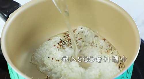 2锅中倒入洗净的宝宝粥米和浸泡好的藜麦,倒入800毫升清水。