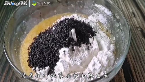 6倒入低筋面粉和熟芝麻。