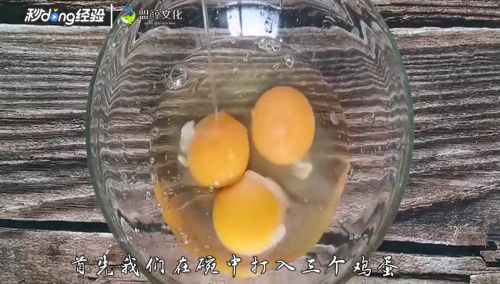 1碗中打入三个鸡蛋。