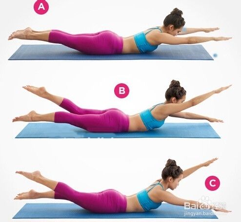 A.俯卧于瑜伽垫上(也可以在床上),双腿微微分开并伸直,依靠臀部和下腰部的力量使其抬离地面。双臂打开置于空中并向前方伸直。头部要保持平视的角度。