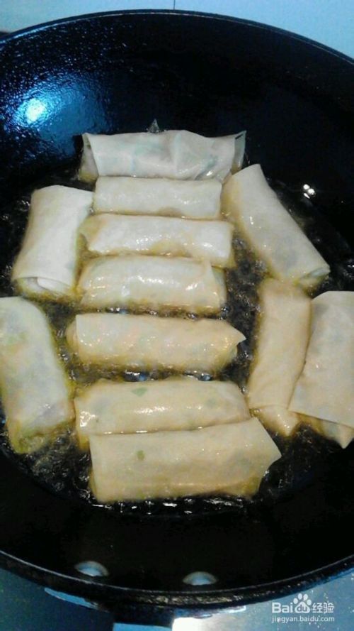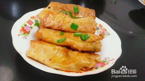 再次起锅烧油,将油烧至五成热,将包好的豆腐皮春卷,春卷逐个下锅炸至金黄色时,捞出盛盘即成。