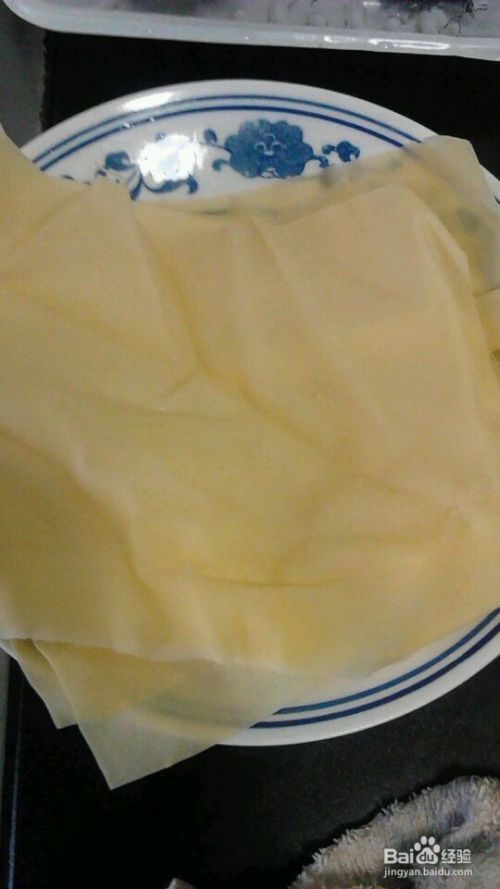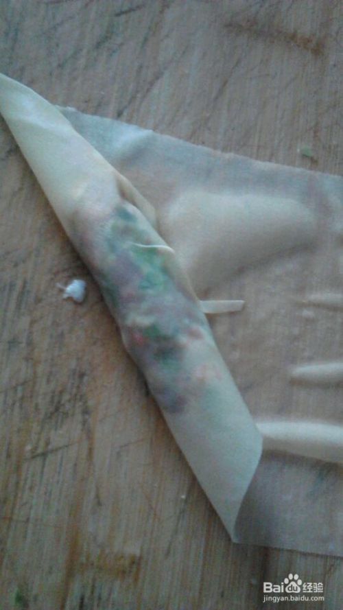 将这些炒好的菜和配料放在豆腐皮上,豆腐皮置案板上铺开,包馅成卷,在合口处涂上面糊