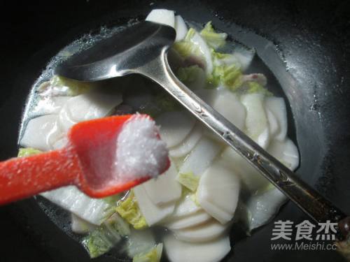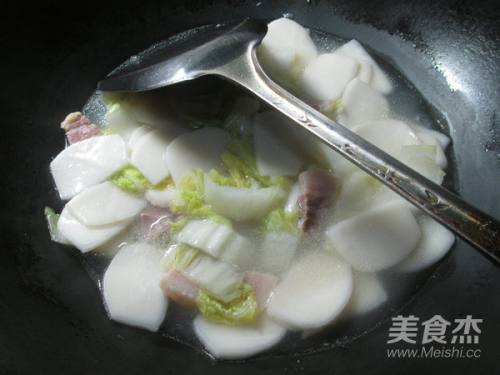 接着,合入切好的年糕,加适量的清水煮开,煮至白菜熟透。