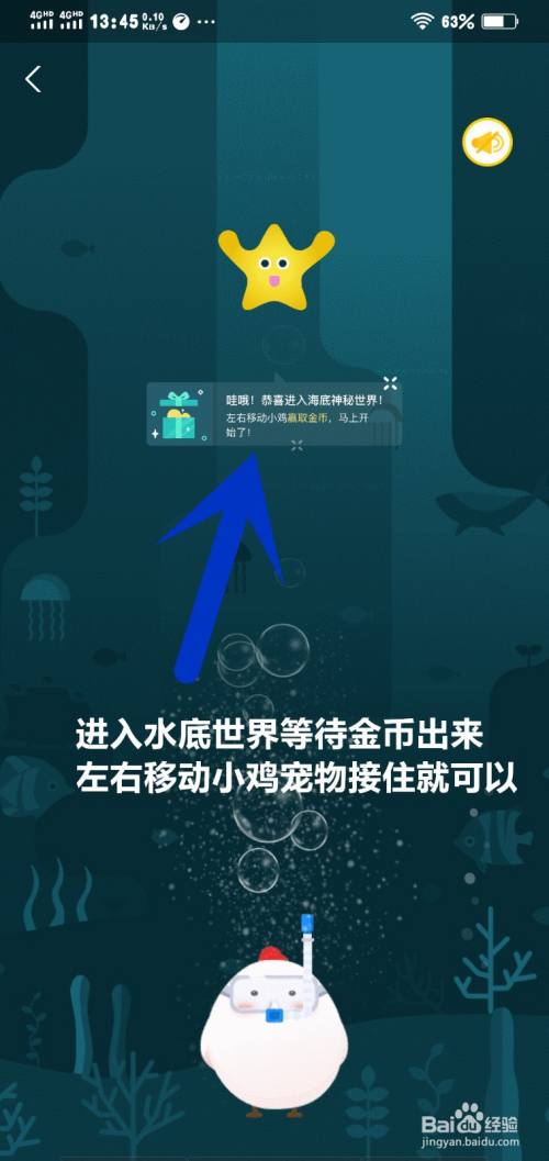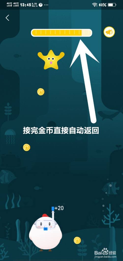 小鸡宠物到了水部分关卡就会进入水底世界,等待金币出现左右移动小鸡宠物接住金币。接完自动返回登山赛游戏页面。