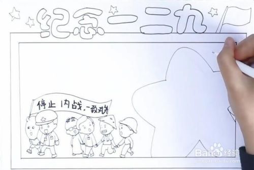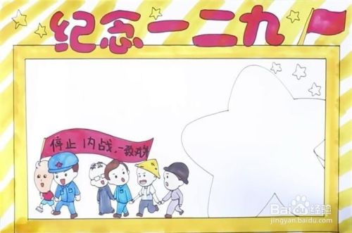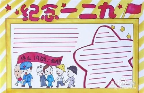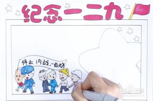 先写上“纪念一二九”几个字,接着画上一个矩形的双边框,然后在边框里画上一群人,举着横幅,上面写着“停止内战,一致对外”,再在旁边画上一个大大的五角星,最后再涂上颜色,画上横线,这样,纪念一二九手抄报就完成了。
