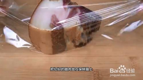 准备一块保鲜膜,把切好的腊肉放在保鲜膜上,把腊肉全部包裹起来,包的时候一定要把里面的空气排出来。