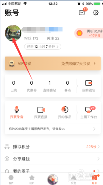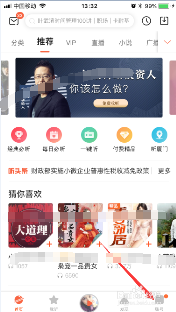 首先,打开一个的喜马拉雅FM的进入到该界面当中。点击了右下角中的 账号 的选项。
