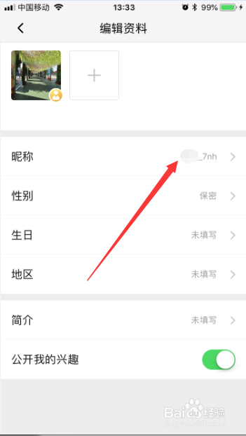 进入到了编辑资料的界面当中,点击 昵称 的选项。