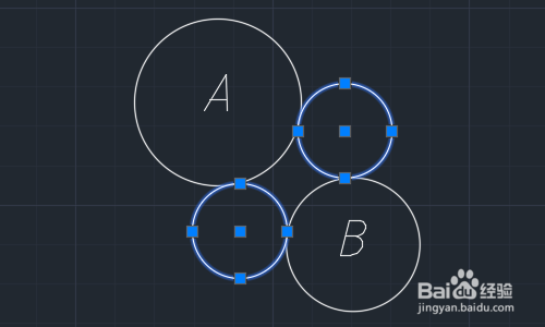 (5)切点+切点+半径:分别在圆A、圆B上指定一个切点,输入半径300,按空格键确认,一个与圆A、圆B相切的圆就画好了,如下图所示: