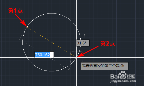 (3)二点:鼠标在屏幕上指定圆的二个端点,圆就画好了,并且这二个端点的连线就是圆的直径,如下图所示: