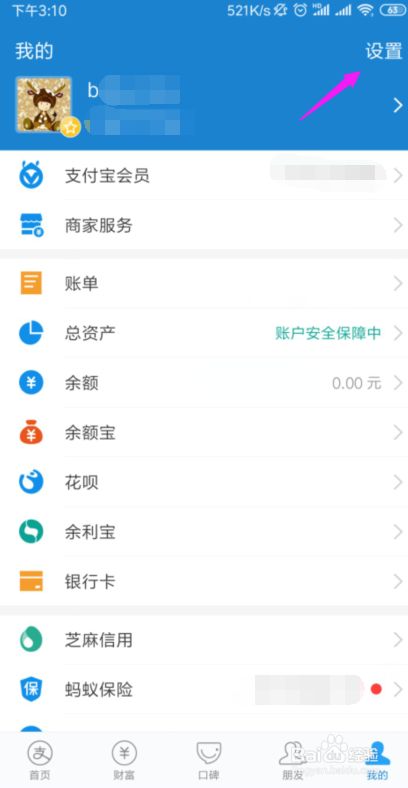 在支付宝的【我的】这儿,小手继续点【设置】了,如图。
