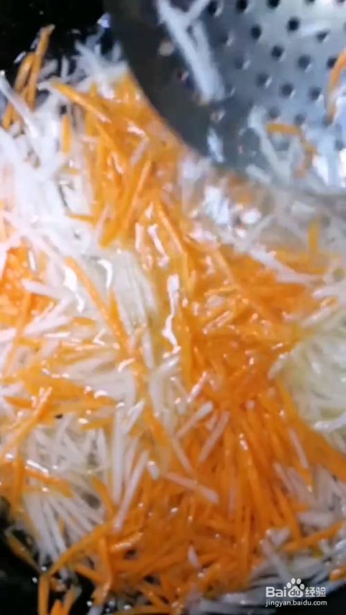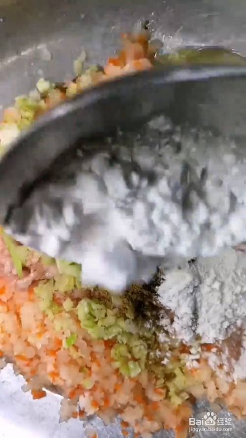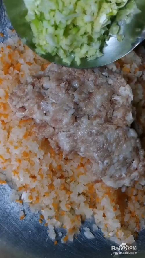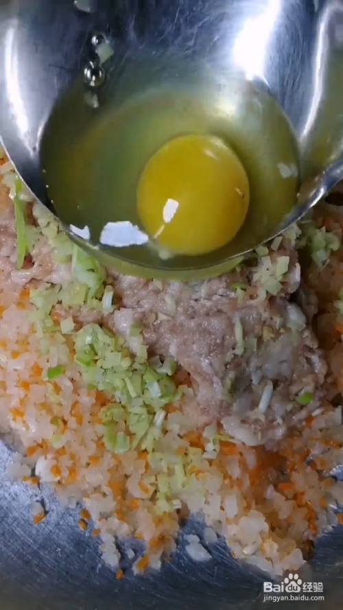 白萝卜,红萝卜,切成丝,洗干净,用刀剁碎,放入6克猪肉馅,2克葱姜末,打入1个鸡蛋,1勺盐,1勺鸡精