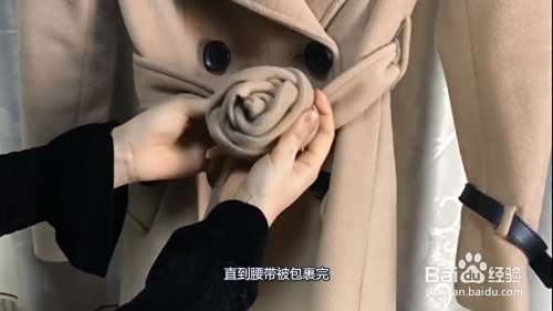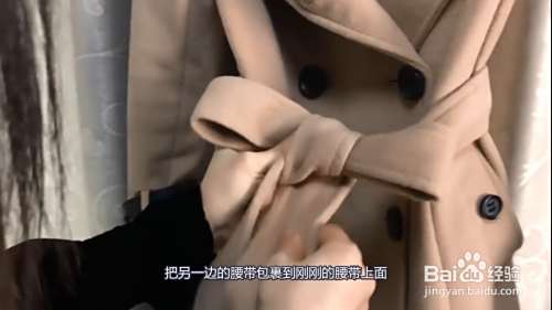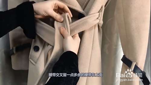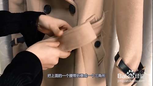 把大衣腰带折叠到一起,折成一个三角形,从中间穿过整理一下腰带,这样我们的腰带就系好了,具体方法如下: