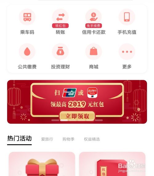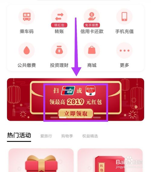 在云闪付主页轮播界面,找到领2019红包标识,点击进去即可。