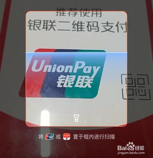 在扫描二位界面,对准银联标识,靠近扫描即可。银联标志可以在银行卡或者云闪付图片里面找。