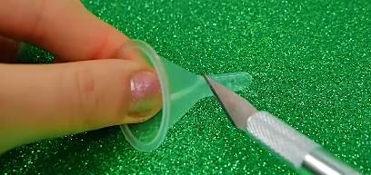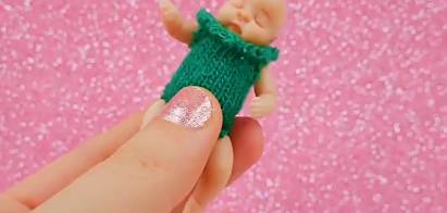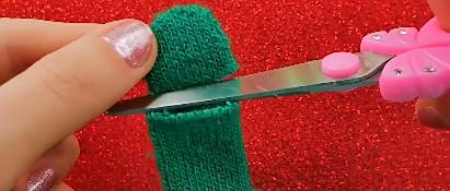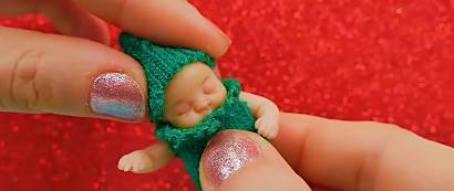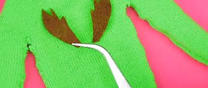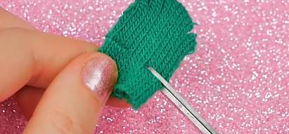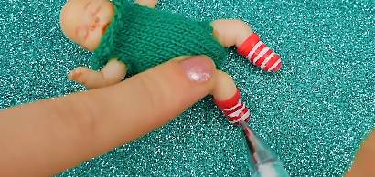 手套给芭比宝宝做一套新衣吧,剪下一节手套,沿着剪四个小口,宝宝的连体毛衣就做好了,再用气球给宝宝做双鞋子吧,鞋子是条纹款的喔,再做一个帽子给宝宝戴上,这样就不会冷了