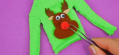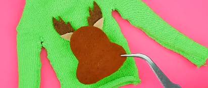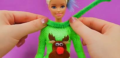 芭比公主也添一件新衣吧,用织布在毛衣上做个可爱的小鹿,贴上嘴巴,眼睛、鼻子、嘴巴,再戴上围巾,芭比穿上很看喔