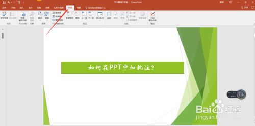 打开Powerpoint,打开需要建立批注的幻灯片,点击标题“审阅”,鼠标左键点击,如图箭头所示