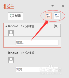 如果一个PPT中出现多个批注,可以通过屏幕右方的批注对话框中上一条、下一条图标进行逐条查找,如图箭头所示。这样就完成了加注批注以及显示批注查找批注的全过程了。