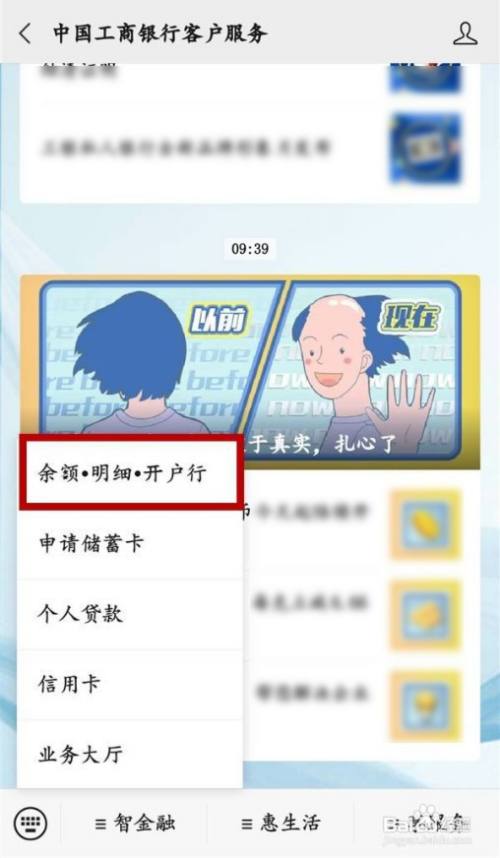 打开该公众号后,点击左下角的智金融--余额.明细.开户行。