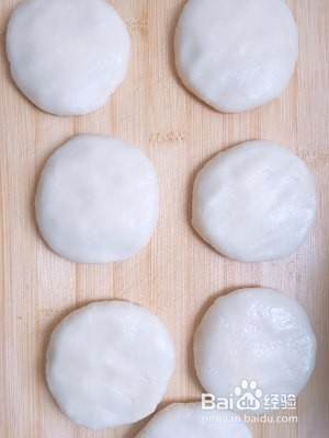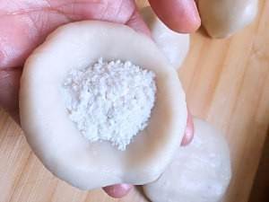 用拇指旋转捏出一个小窝,放白糖面粉进去