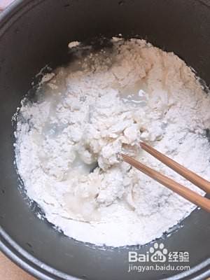 烧开的甜品倒入160克面粉里面,不停搅拌