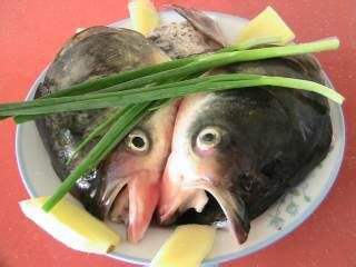 先将鱼头洗净去除鱼鳃、鱼鳞,将其斩半