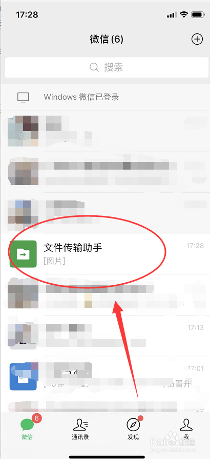 在手机上,打开微信,找到文件传输助手窗口