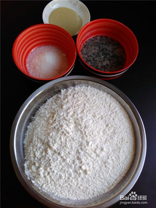 备好原材料:面粉,酵母粉,白糖,火龙果酱。