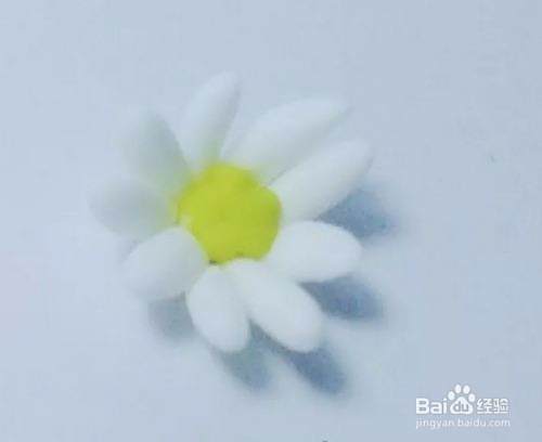 取一小块黄色粘土拍成扁扁圆圆的做花心,再取白色粘土慢慢捏成细细长长的椭圆形做成雏菊小花瓣,这样漂亮的小雏菊就做好了。