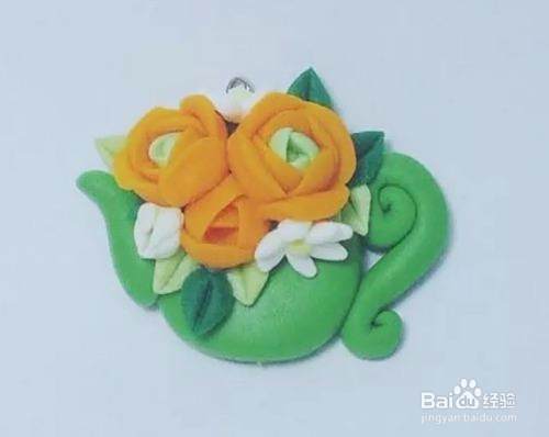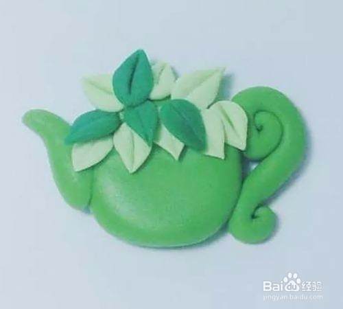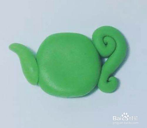 首先,取一块大小适宜的绿色粘土,将它揉搓成圆扁状,一定要揉至表面光滑哦,再将扁圆的一侧加上圆圆长长的类似茶壶嘴状的绿色粘土,再取一块绿色粘土将其搓成弯弯的有点像耳朵状的粘土粘在圆扁形的另一侧,如图即可。