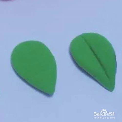取深绿色的粘土其分成一小块一小块的,慢慢的捏成近似水滴状,用工具将其中间轻轻画出叶脉来,用手轻轻整理下即可,再取浅绿色粘土按照这样的方法捏几片叶片就好了。