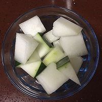 冬瓜带皮切成小块,洗的时候一定用盐水浸泡5-8分钟,冲洗干净后备用