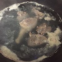 斩好的鸭块放入凉水锅里至开锅3分钟左右,焯水一边,焯水后的鸭块捞起冲洗血沫备用