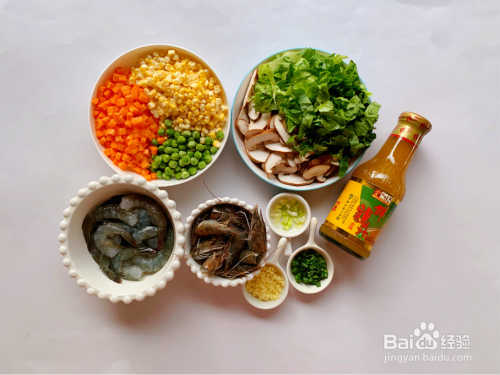 准备好食材:姜切末、葱白葱绿分开切葱花,胡萝卜去皮切小,玉米掰粒;鲜虾去虾壳虾头和虾线,虾头留用