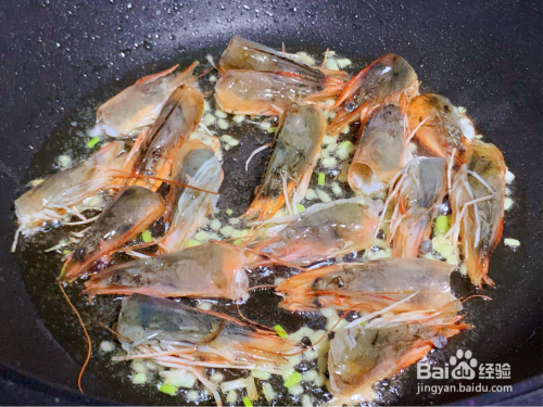 放入虾头煎出虾油,盛出虾头和葱姜