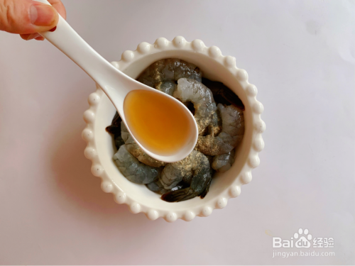 虾仁加入1勺料酒+适量胡椒粉