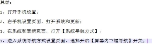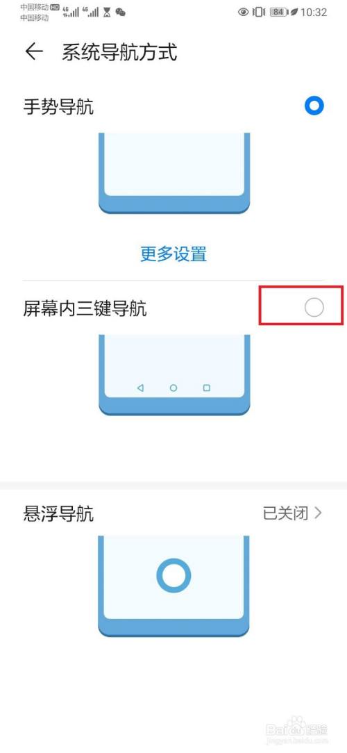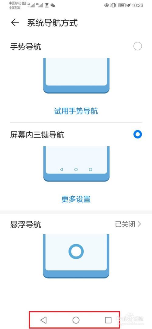进入系统导航方式设置页面,选择开启【屏幕内三键导航】开关,如下图所示。