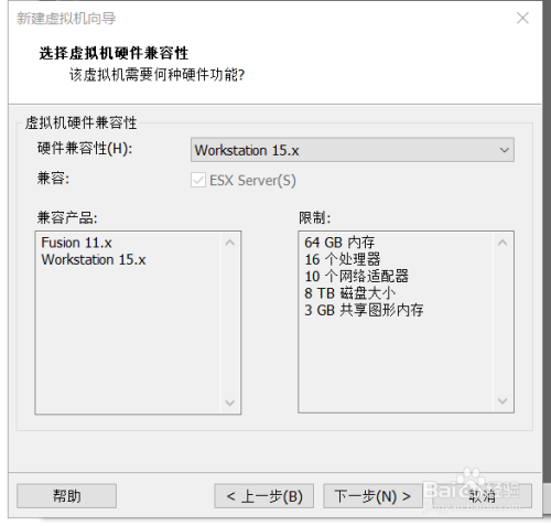 在硬件兼容性下拉列表中选择对应的版本。选择相应的版本后,因VMware Workstation有很多版本,创建的虚拟机只能在比所选择版本高的虚拟机上运行,比如你创建的虚拟机可能将来要放到Workstation8.0的版本上运行,那你就不能选择比8.0高的版本。各版本的区别可以选择相应版本后可以在该窗口中间位置的“兼容产品”和“限制”框中进行对比。我们在这里保持默认,点击“下一步”。