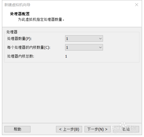 为虚拟机指定要使用的物理CPU数量,总数量不得超过物理CPU的总数量。没有特殊需要的话一般使用默认即可。点击“下一步”。