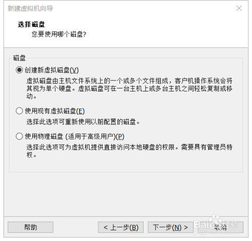 “选择物理磁盘”,将整个物理硬盘分区作为该虚拟机的硬盘,但这会使物理机能够直接访问虚拟机中的文件,破坏了虚拟机与物理机的隔离,一但物理机误操作,将导致虚拟系统的损坏。一般我们使用“创建新虚拟硬盘”,点击“下一步”。