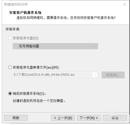 选择安装来源,主要有三种,一是直接使用物理机的光驱;二是使用光盘映像文件。这两种方法在创建好虚拟机后会自动启动虚拟机进行操作系统的安装。第三种是稍后安装操作系统,该方法是新创建好一个空白硬盘,等待我们手动设置安装来源后启动虚拟机进行安装(一般都是使用该方法)。在这里我们选择“稍后安装操作系统”点击“下一步”。